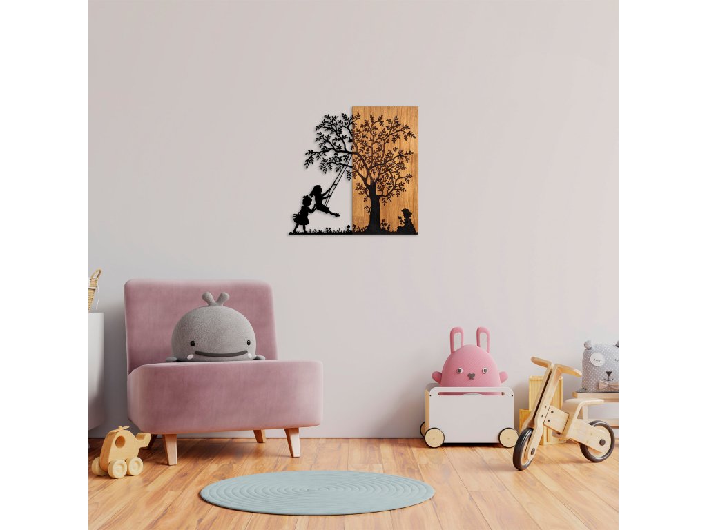 Zvolený motiv hrajících si dětí pod listnatým stromem je v tomto případě vyjádřen vypálenou kresbou na dřevěné desce, která volně přechází v kovové ztvárnění tohoto motivu a má potenciál přinést do vašeho interiéru romantickou atmosféru vracející vás do doby bezstarostného dětství.