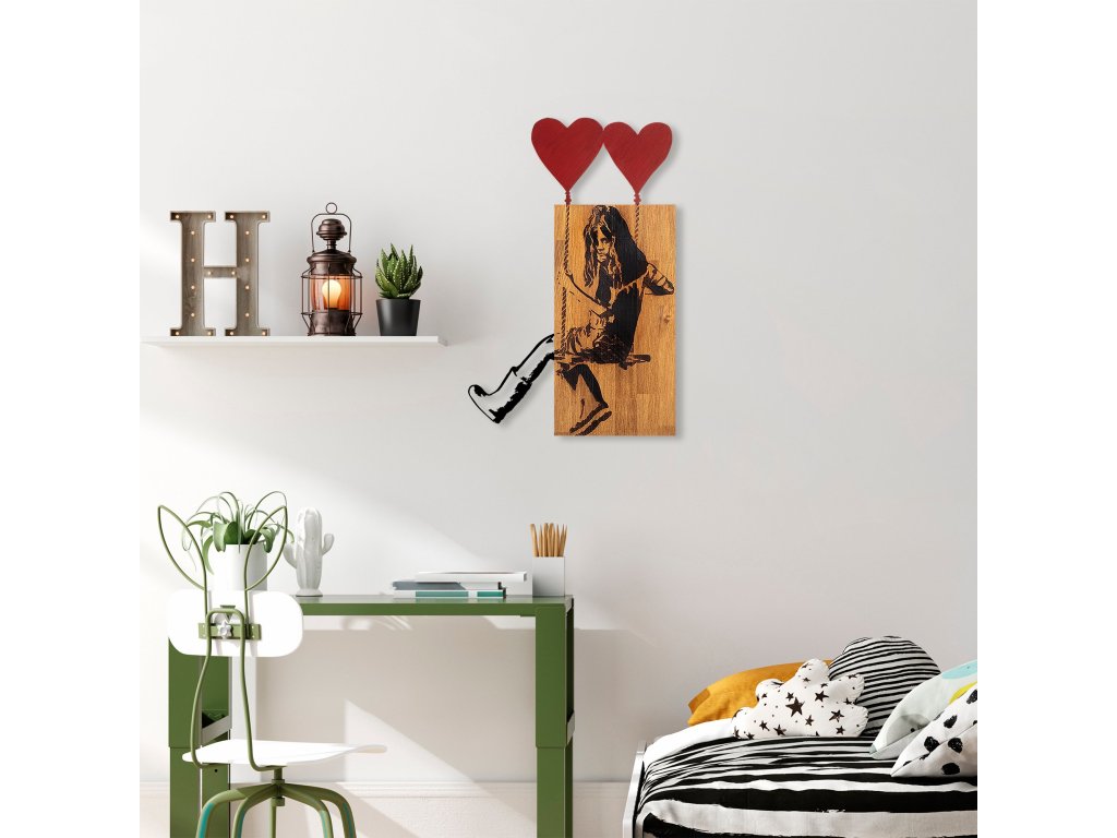 Ústředním tématem této nástěnné dekorace je DÍVKA NA HOUPAČCE, která je ukotvena do dvou červených srdcí.