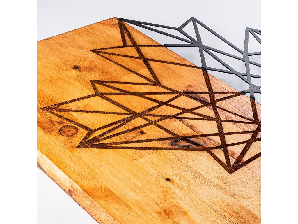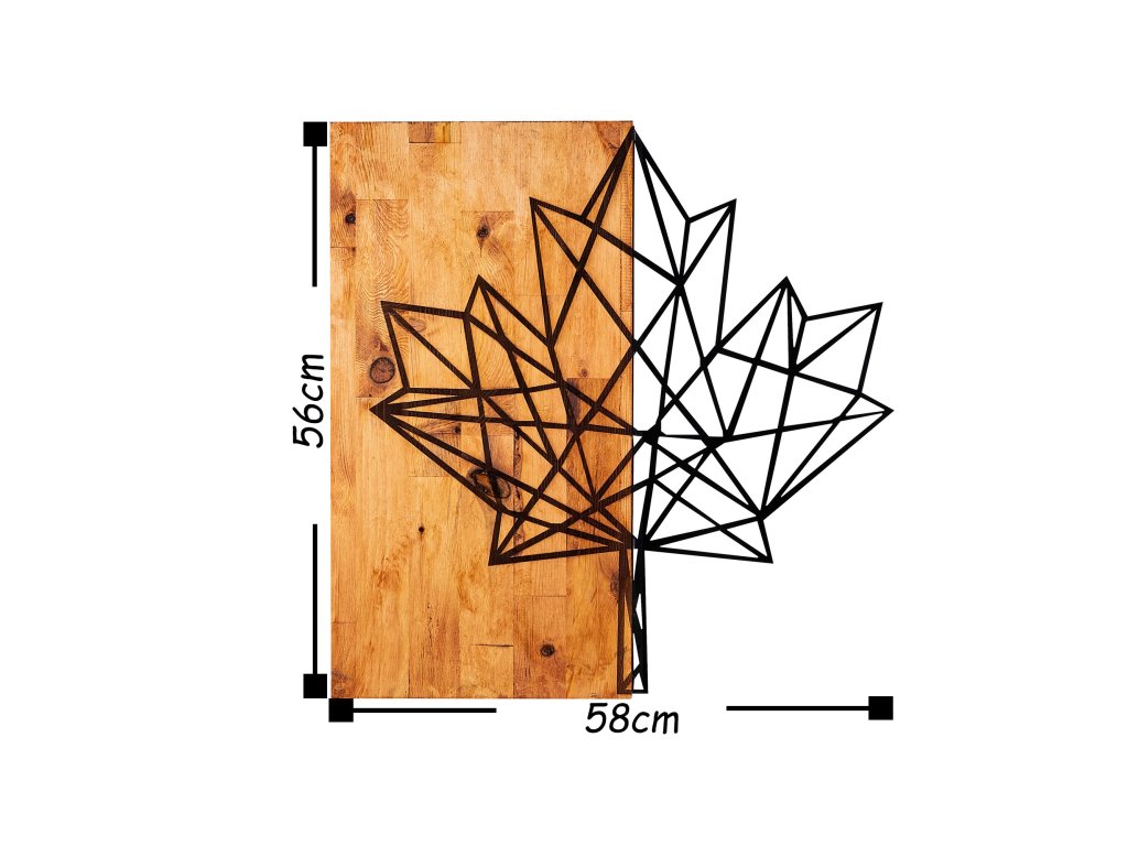 Zvolený motiv JAVOROVÝ LIST je v tomto případě vyjádřen vypálenou kresbou na dřevěné desce, která volně přechází v kovové ztvárnění tohoto motivu a má potenciál přinést do vašeho interiéru originální atmosféru.