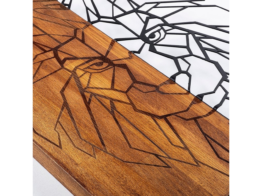 Z kvalitní dřevěné desky a černého kovu vyrobená nástěnná dekorace s hlavou lva může designově obohatit jakýkoliv interiér.