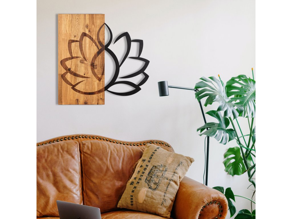Dřevo-kovová nástěnná dekorace zobrazuje ozdobný LOTOSOVÝ KVĚT, který má v řadě náboženství a kultur silný duchovní význam.