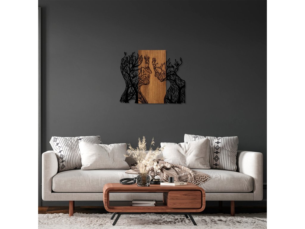 Dřevo-kovová nástěnná dekorace zobrazuje částečnou siluetu muže a ženy a může mít mnoho interpretací jako například: MUŽSKÁ A ŽENSKÁ ENERGIE.