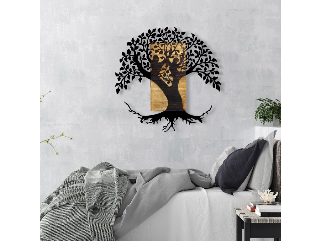 Unikátní dřevěná nástěnná dekorace s vyčnívajícími kovovými černými větvemi a kořeny může být vhodným dárkem nebo i pěkným doplňkem interiéru.