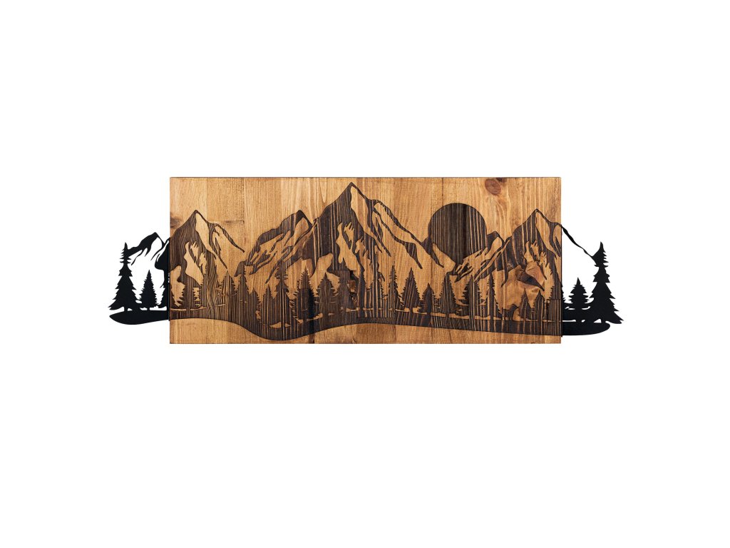 Dřevěná deska s černou vypálenou kresbou je nastavená kovovými pláty a ztvárňuje ZÁPAD SLUNCE V HORÁCH, přičemž dokonale kombinuje přírodní a industriální styl a jistě udělá radost nejen milovníkům hor.