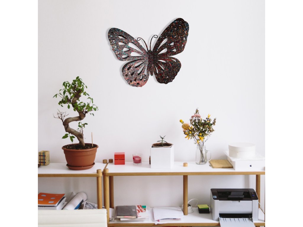 Dechberoucí ručně vyrobená nástěnná dekorace v podobě kovového motýla, který se může pyšnit barevnými flíčky na obou párech křídel.