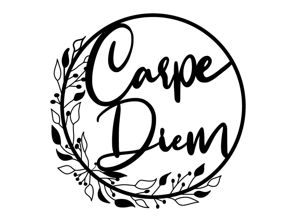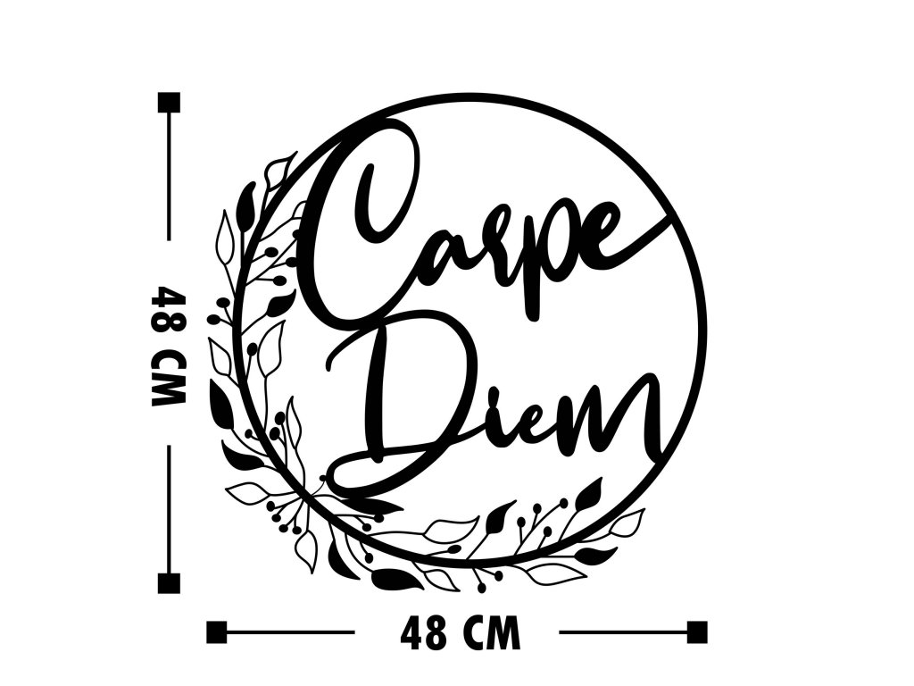 V kruhu usazená dvě slova nám napovídají, abychom si užili každého dne a abychom na to nezapomínali, můžeme si to připomínat každý den díky nástěnné kovové dekoraci, která nám to ve vhodné místnosti ráda připomene.