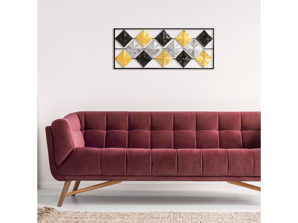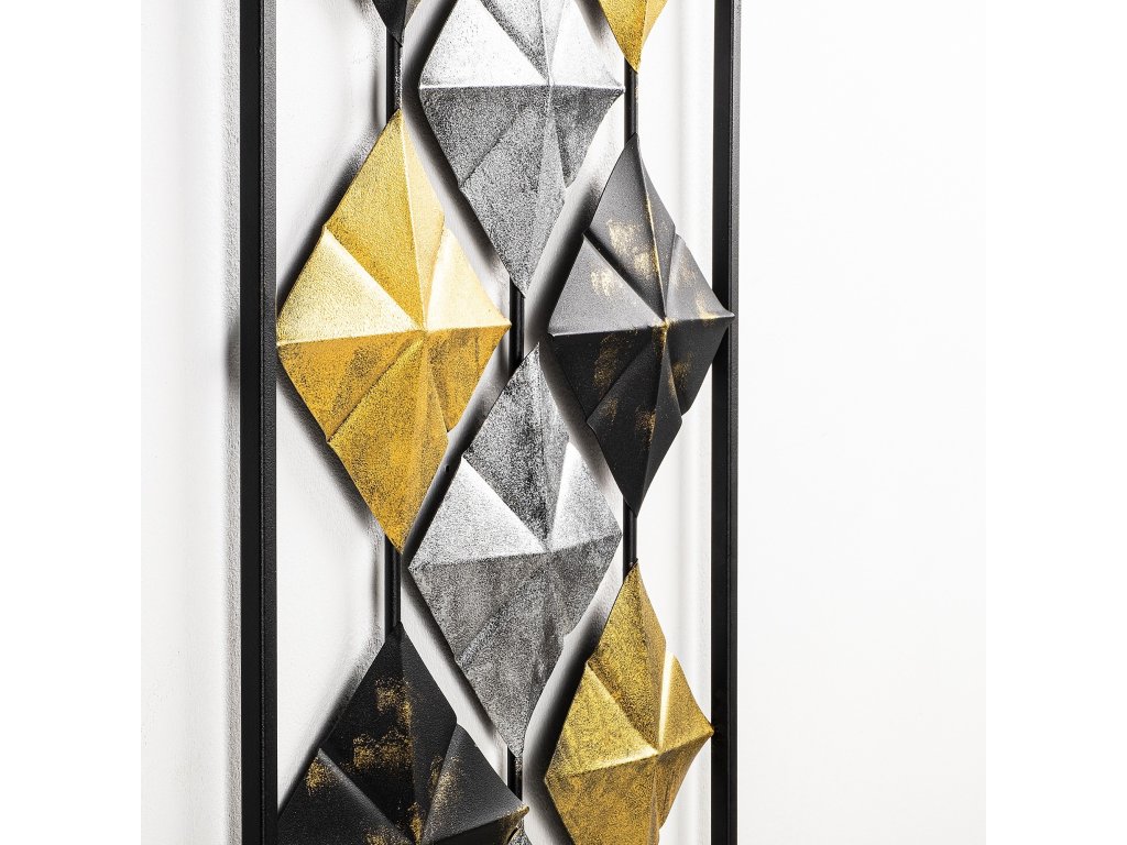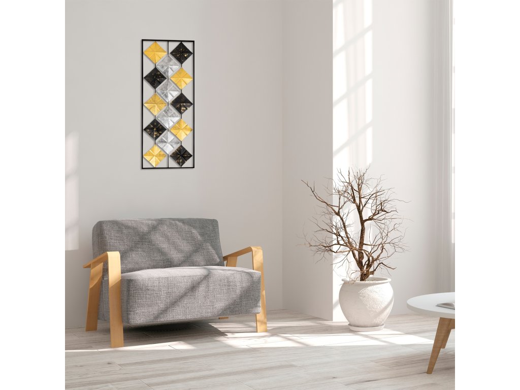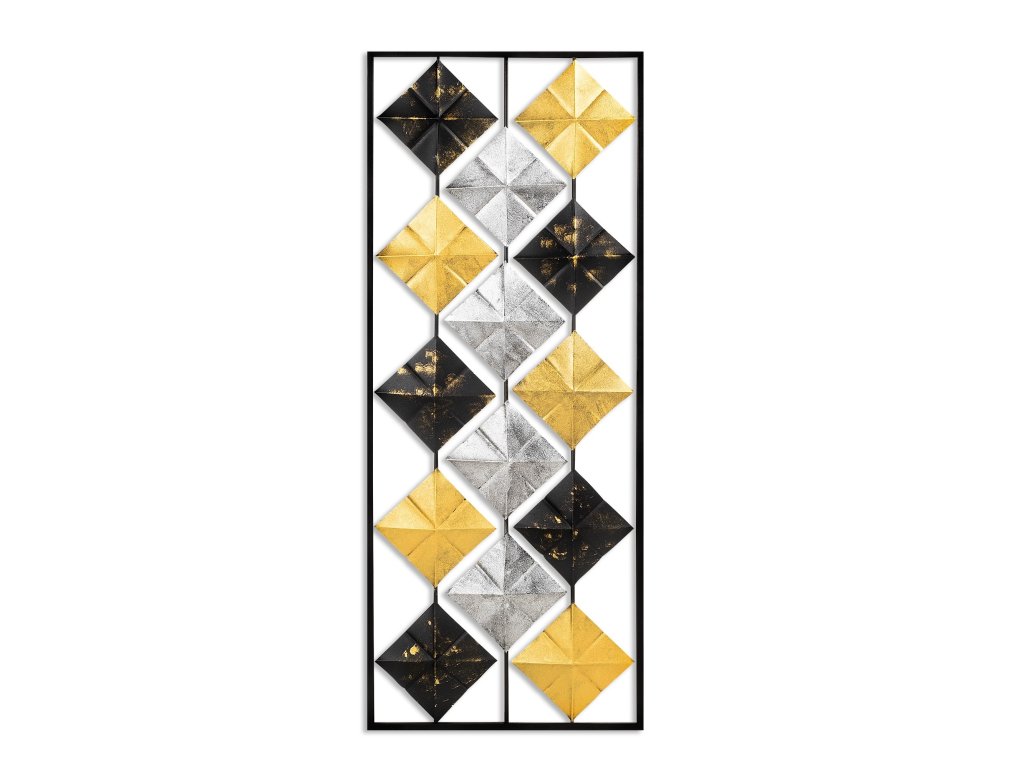 V černém rámu diagonálně seskládané trojice čtverečků nesoucích černou, stříbrnou a zlatou barvu tvoří společně elegantní nástěnnou dekoraci.