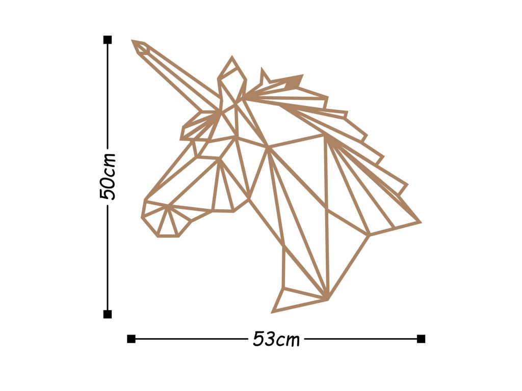 Z různých kovových trojúhelníčků složená hlava jednorožce má jemnou měděnou barvu a může být doménou nejednoho dětského pokojíčku.