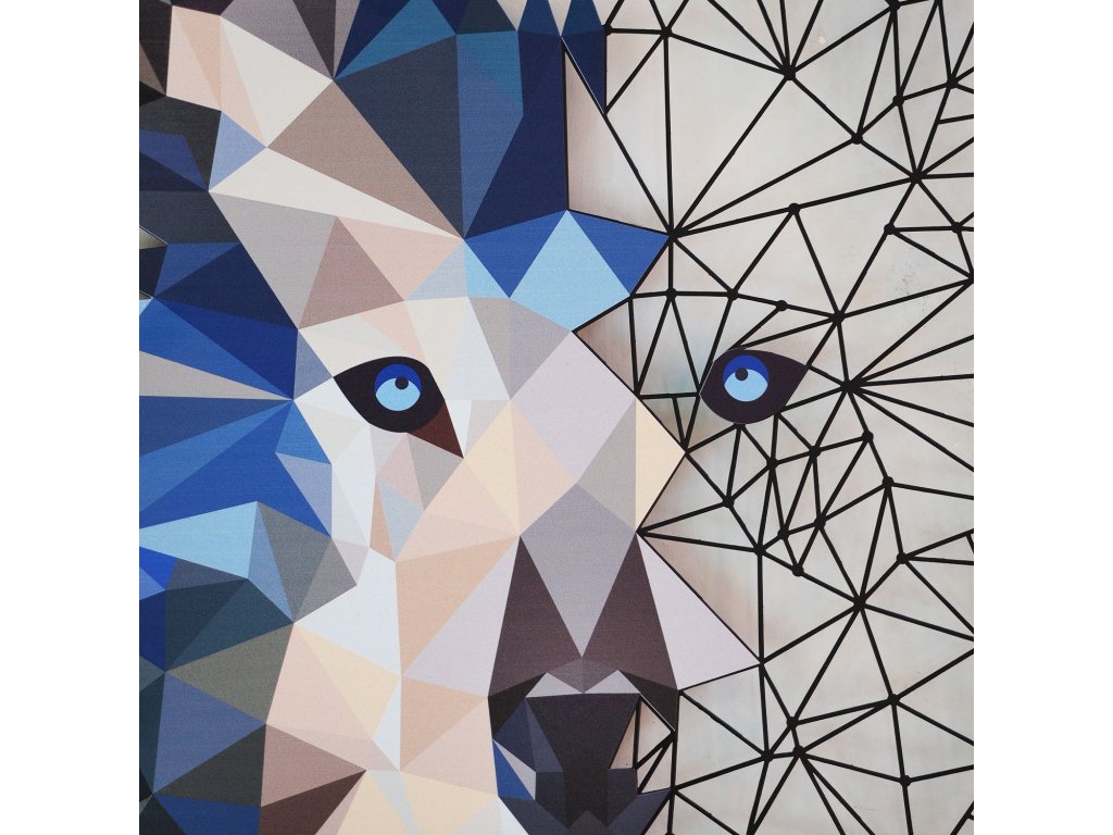 Z různě velkých černých trojúhelníčků složená levá strana hlavy vlka je doplněná o domodra laděné levé strany a znázorňuje tuto šelmu v soustředěném pohledu.