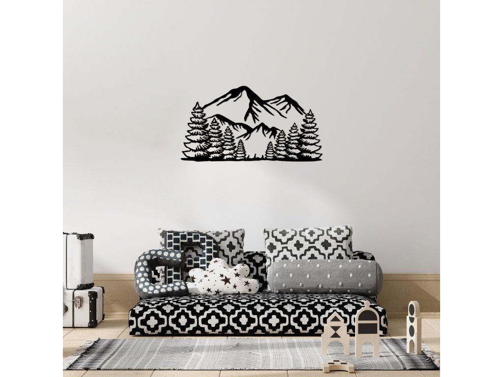 Kovová dekorace znázorňující horskou přírodu může být vhodným doplňkem například nad krbovou římsu.