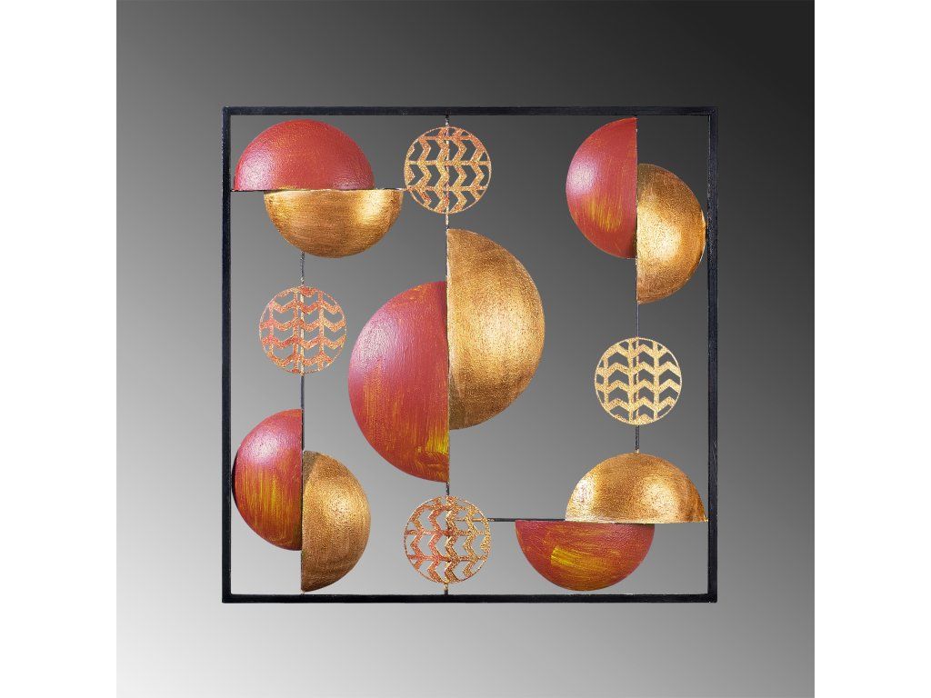 Ve čtvercovém rámu rozmístěné půlkruhové zlato-červené objekty doplněné o perforované kruhy jsou vzájemně téměř neviditelně propojené vytváří moderní kovovou abstrakci.