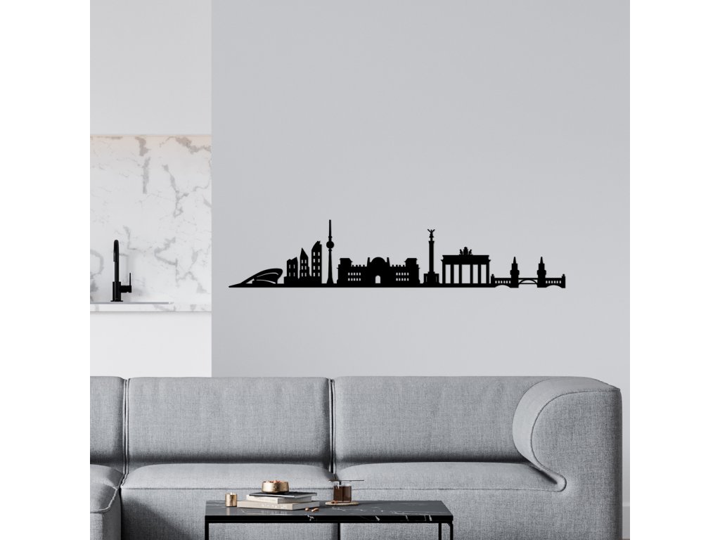 Stín města s dominantními budovami, mostem i paláci je motivem nástěnné kovové dekorace, která může designově ozdobit místnost a současně i vyvolat vzpomínku na dosud navštívená města.