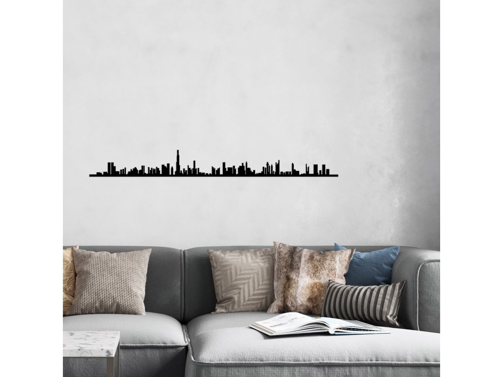 Stín města s dominantními budovami je motivem nástěnné kovové dekorace, která může designově ozdobit místnost a současně i vyvolat vzpomínku na navštívená města.