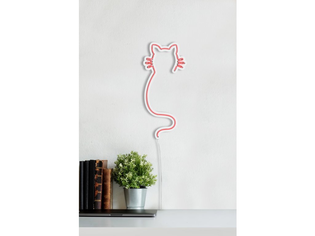 CAT je nástěnná dekorace s led osvětlením znázorňující růžový obrys sedící kočky.