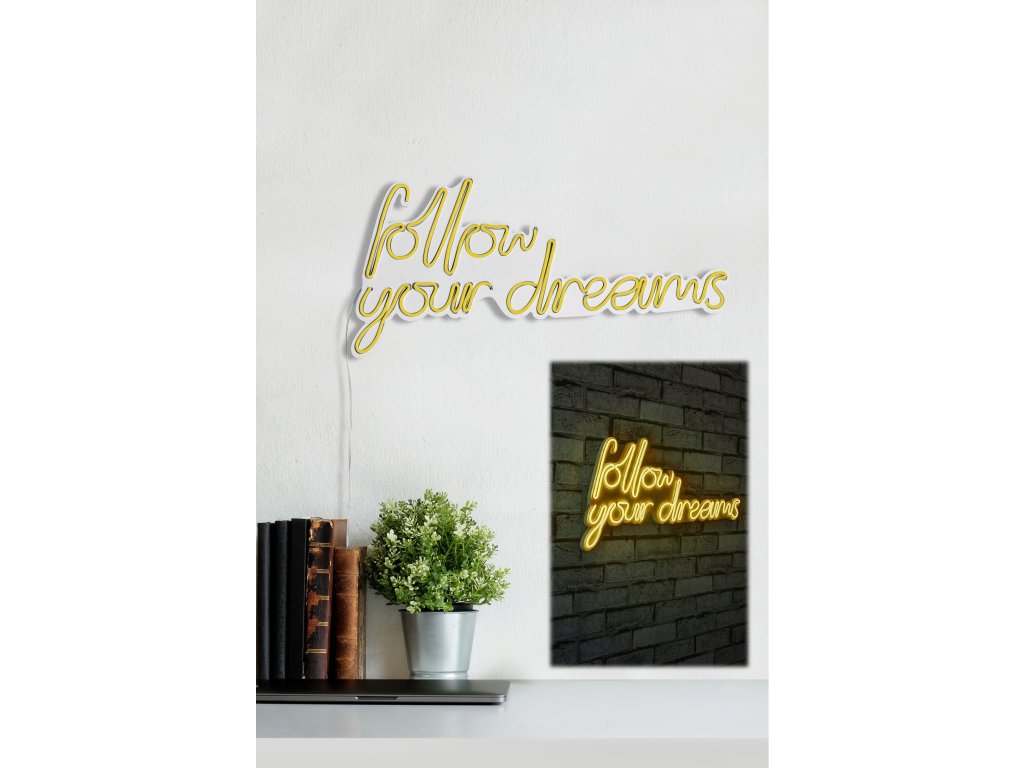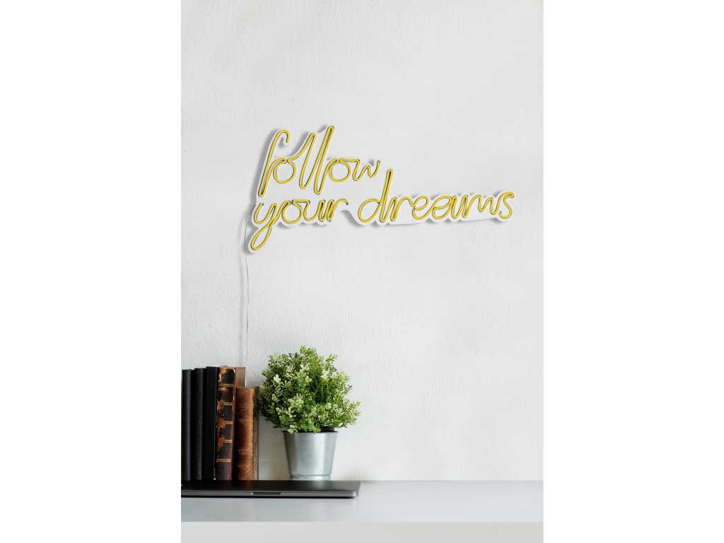 FOLLOW YOUR DREAMS s LED osvětlením je nástěnná dekorace zobrazující žlutý anglický nápis: "Následuj své sny"