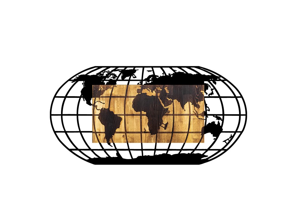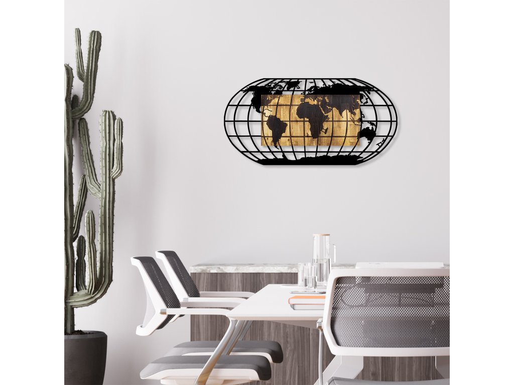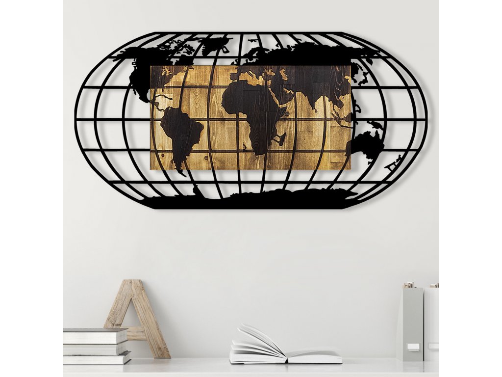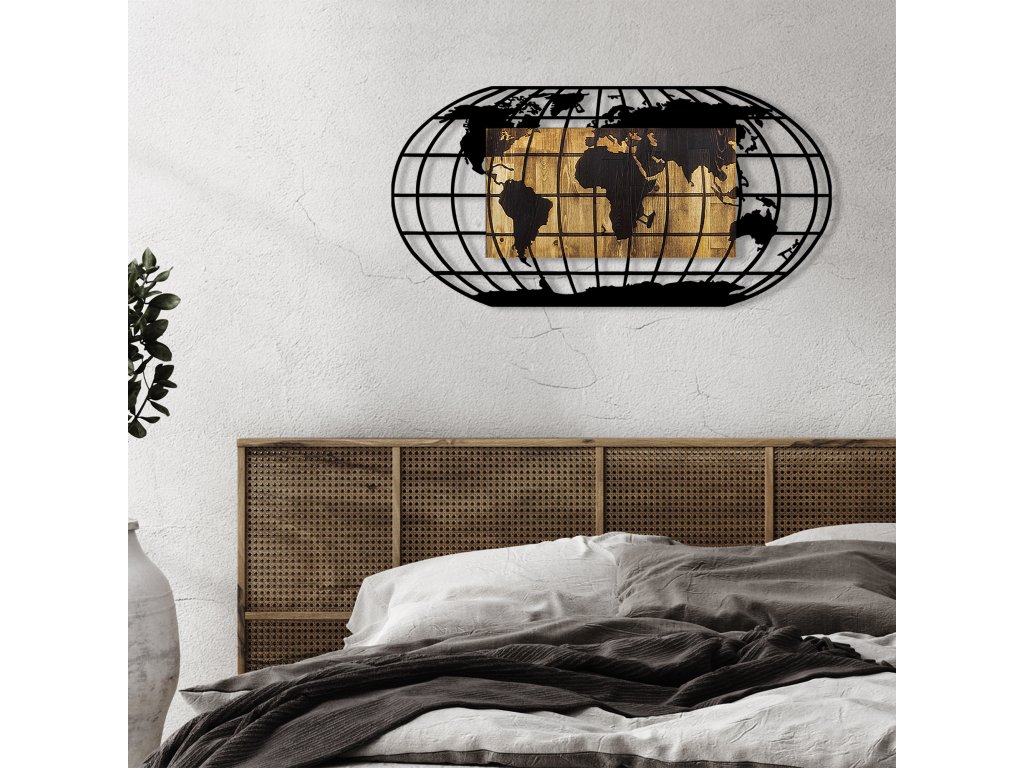 Nástěnná dekorace WORLD MAP dekorativně ozdobí prázdnou zeď například v obývacím pokoji, pracovně nebo i v jiné místnosti.
