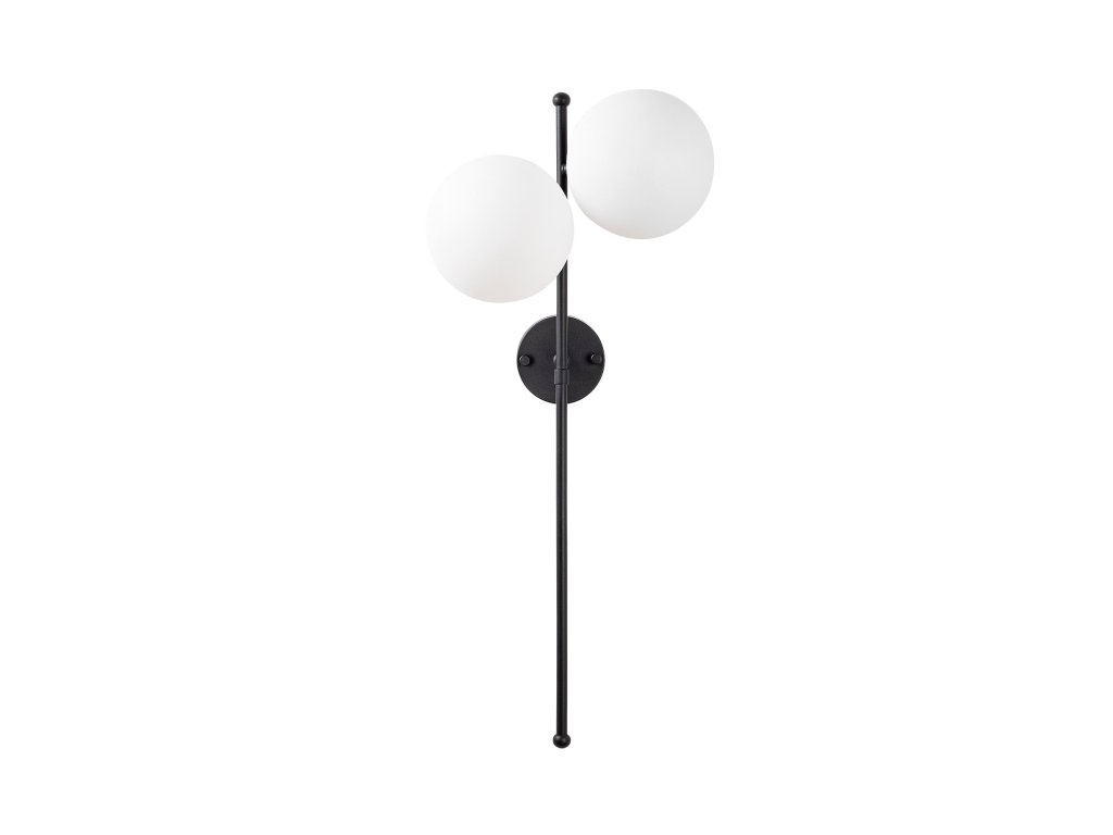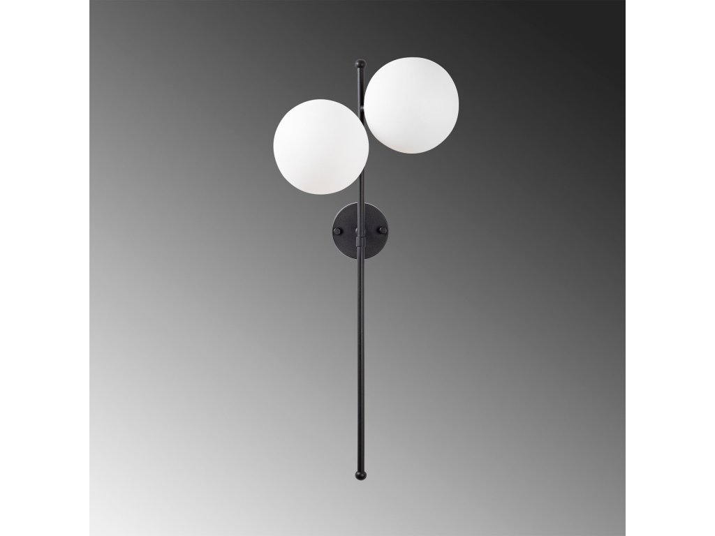 FAZLI je černá nástěnná lampa vyrobená z malé kruhové základny, která drží dlouhé rameno se dvěma nahoře ukotvenými bílými stínítky.