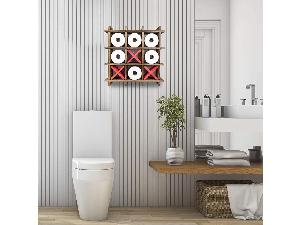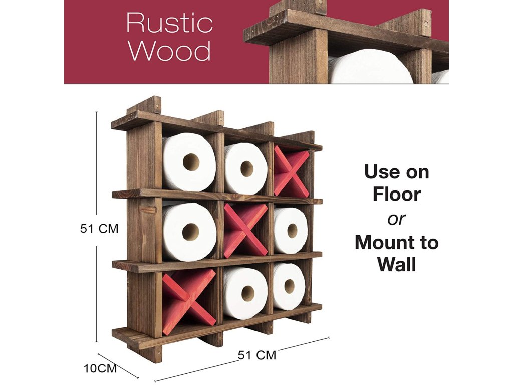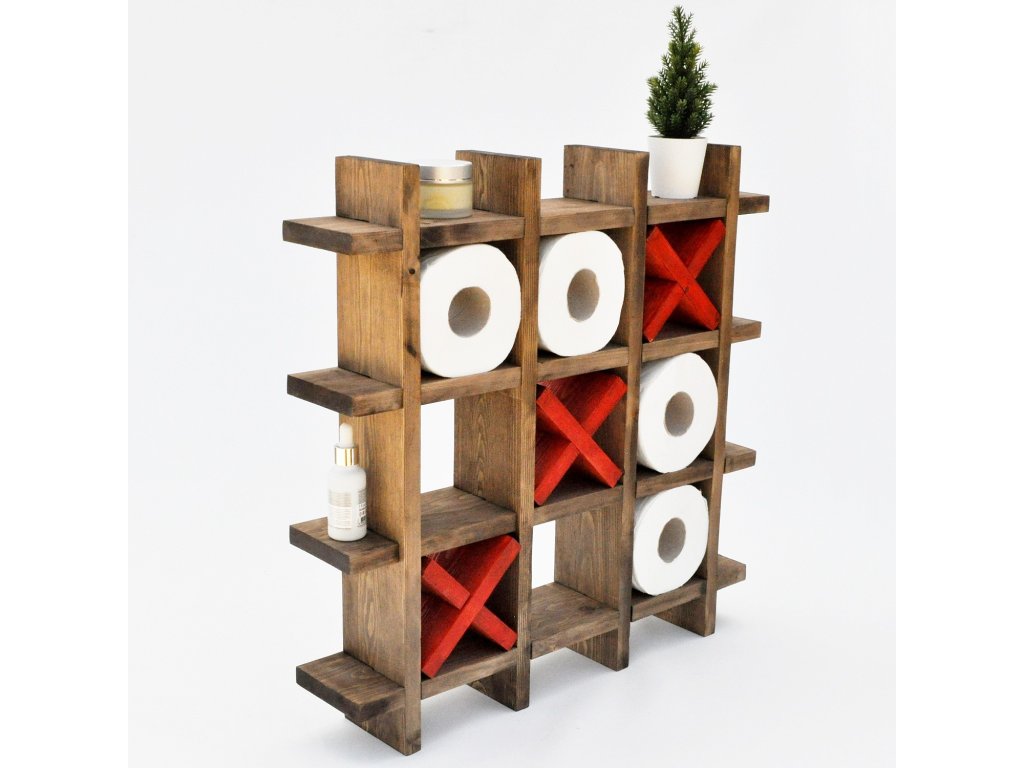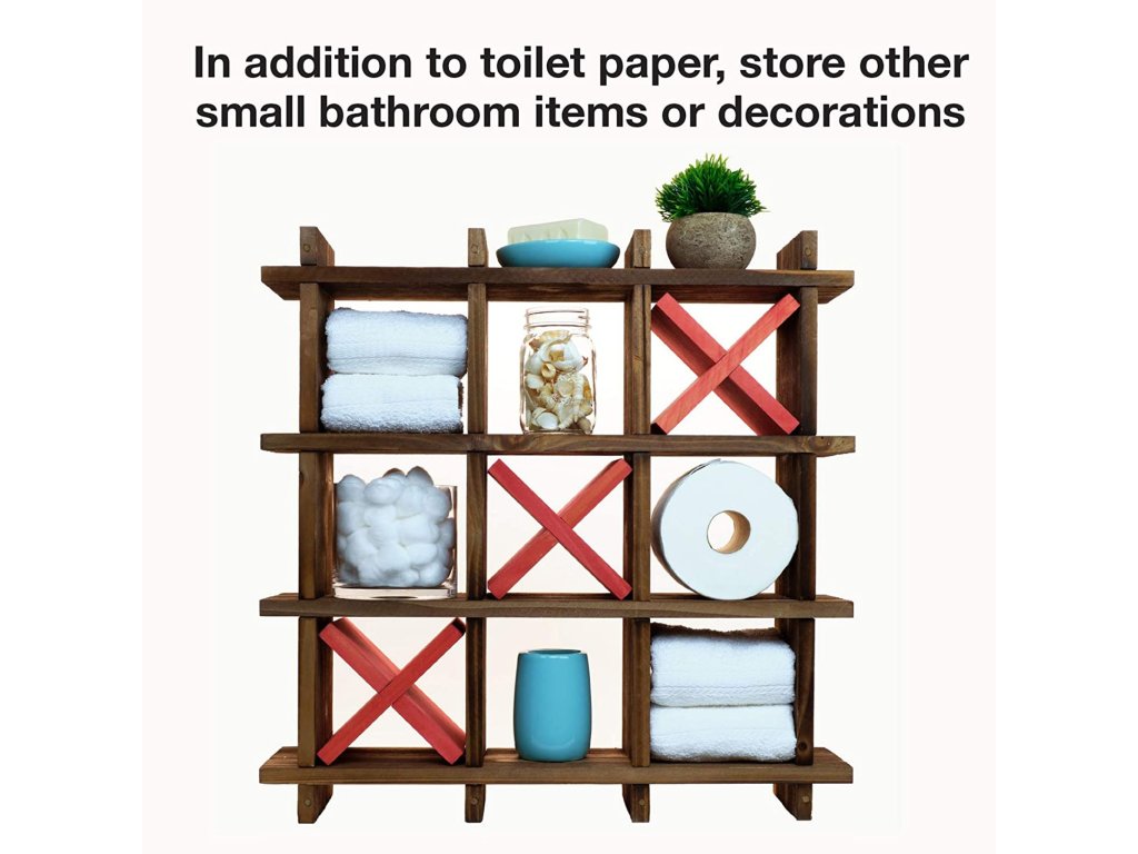 Dobře se dá do polic uklidit toaletní papír nebo ručníky. Polici je možné připevnit na zeď nebo samostatně postavit na zem.