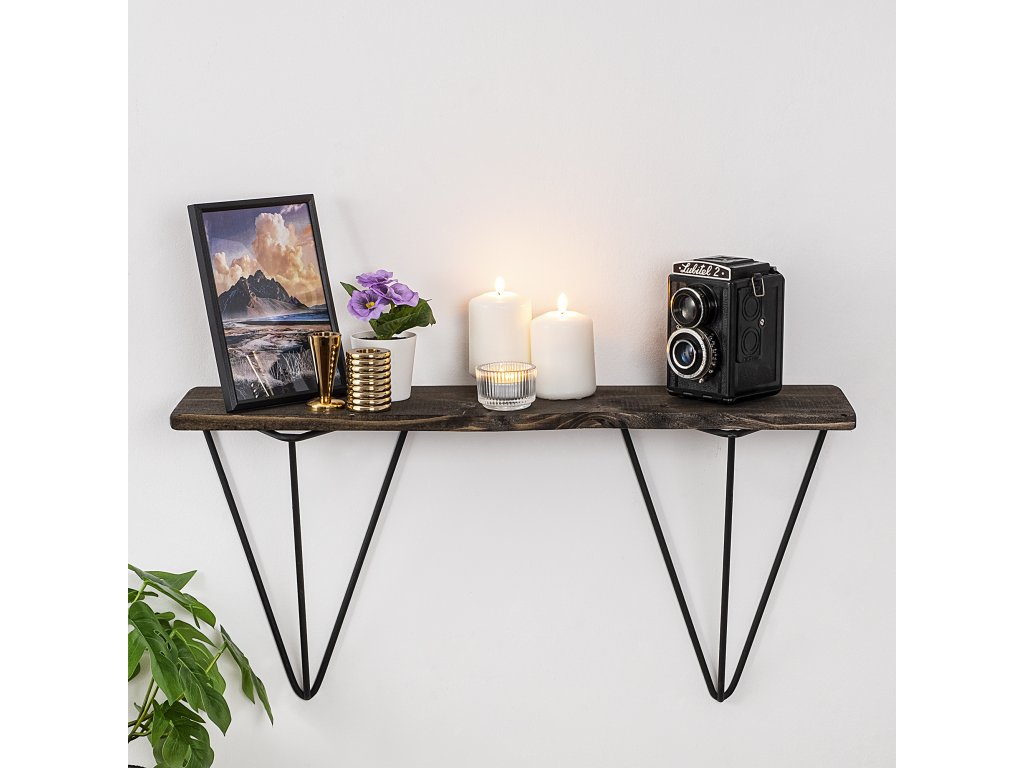 Nástěnná police GLADIOLUS je složená z jedné odkládací desky usazené na dvou trojúhelníkových malých kovových nosnících.