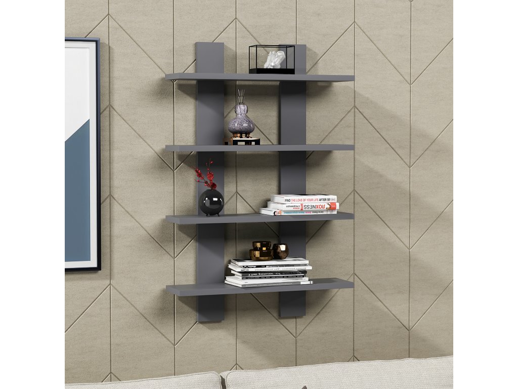 Antracitová nástěnná police LAUREL je tvořena čtyřmi policemi, na které si můžete uložit jak knihy, tak i dekorativní předměty.