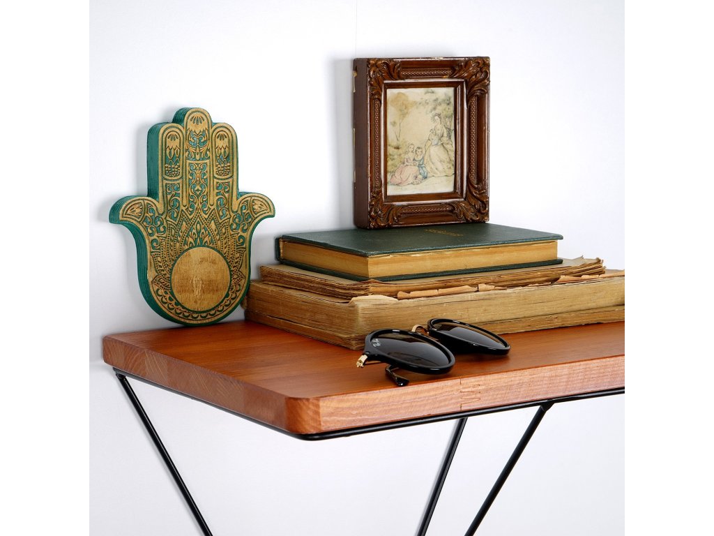 Polička je vyrobena z borovicového dřeva vsazeného do kovového rámu.