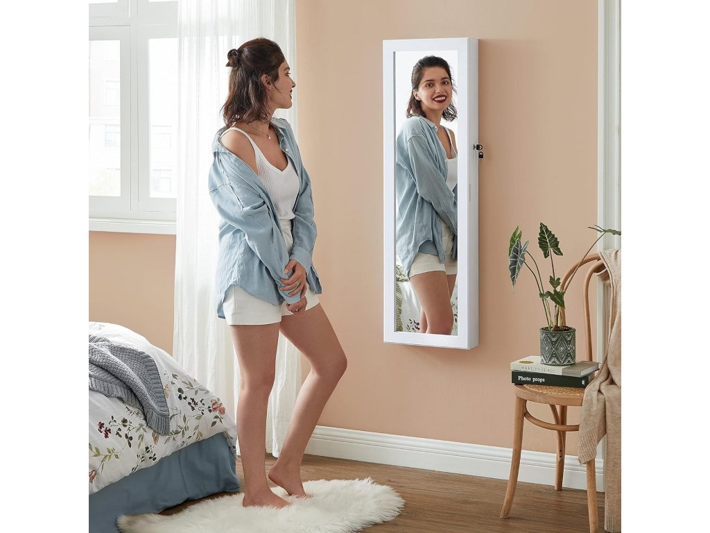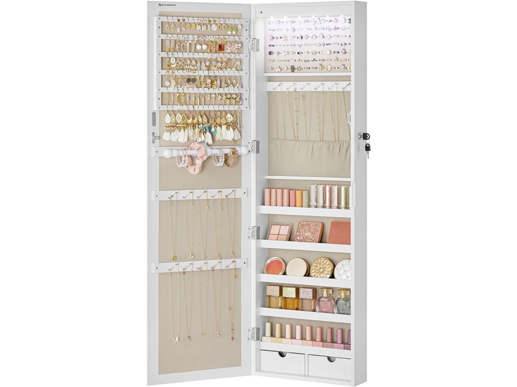 S elegantní šperkovnicí se skleněným zrcadlem, čistými liniemi v elegantní bílé barvě můžete zapomenout na dny, kdy se vám ztrácely a pletly šperky, a povýšit svou každodenní kosmetickou rutinu na vyšší úroveň.