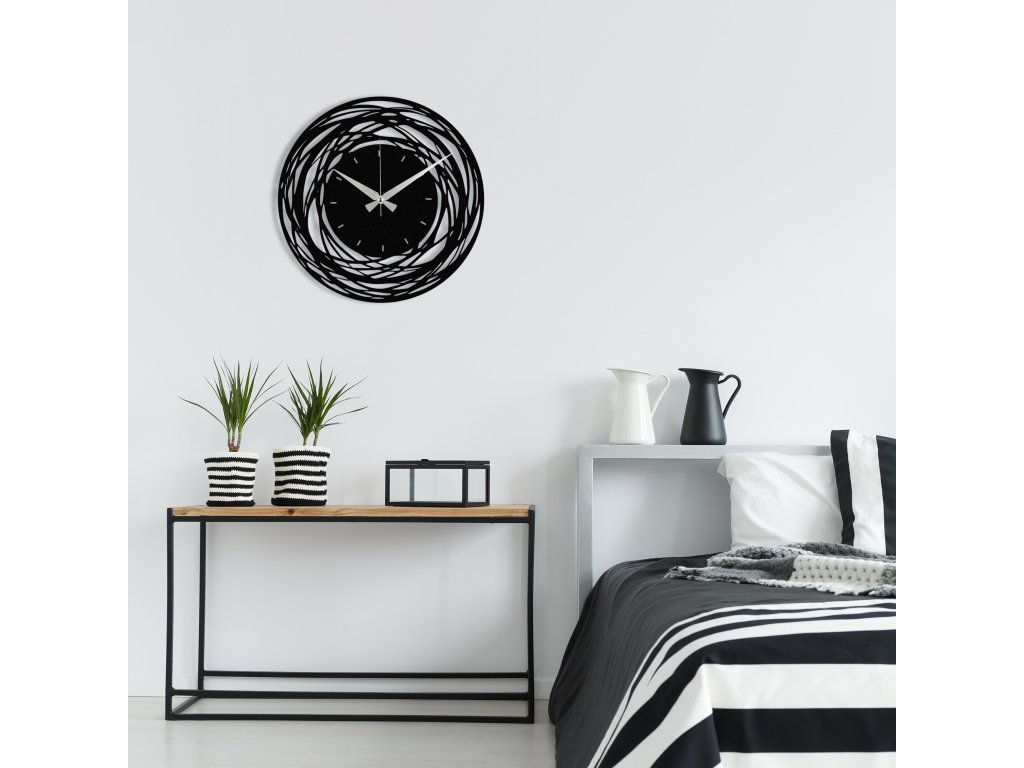 Co však dělá naše kovové nástěnné hodiny skutečně jedinečnými? Jsou vybaveny světlými dlouhými ručičkami, které se ladně pohybují po černém podkladu dvanáctkrát protnou kruh s vyfrézovanými otvory nahrazujícími číslici ciferníku. Hodiny nemají klasický číselný ciferník, a pozornost se soustředí na okrajový drátěný prstenec, který vytváří vizuální efekt hnízda nebo věnce, jenž mnohého pozorovatele zaujme.