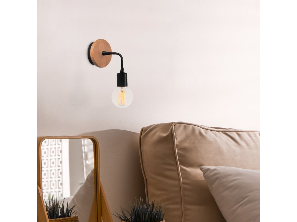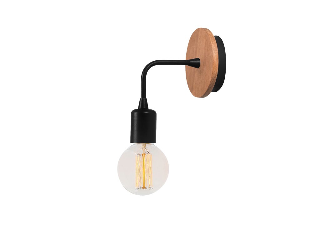 Nástěnné osvětlení DARTINI je vyrobeno z drobné dřevěné základny, z níž krátké černé ohnuté rameno nese objímku bez stínítka.