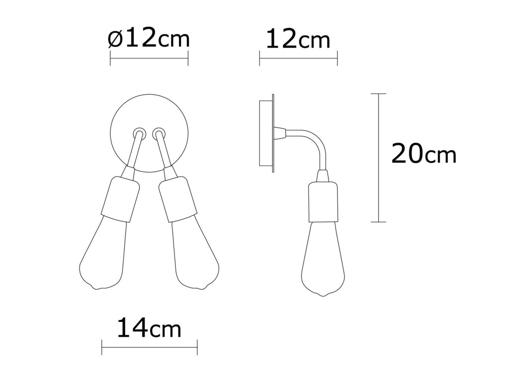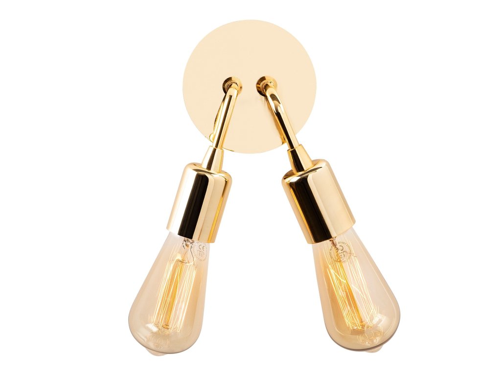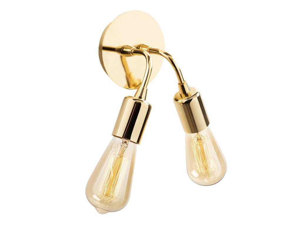 Zlaté nástěnné osvětlení HARPUT je tvořeno dvěma malými z kruhové základny vycházejícími ramenemy, které drží dvě objímky bez stínítek.
