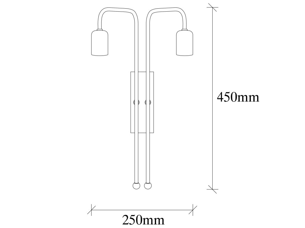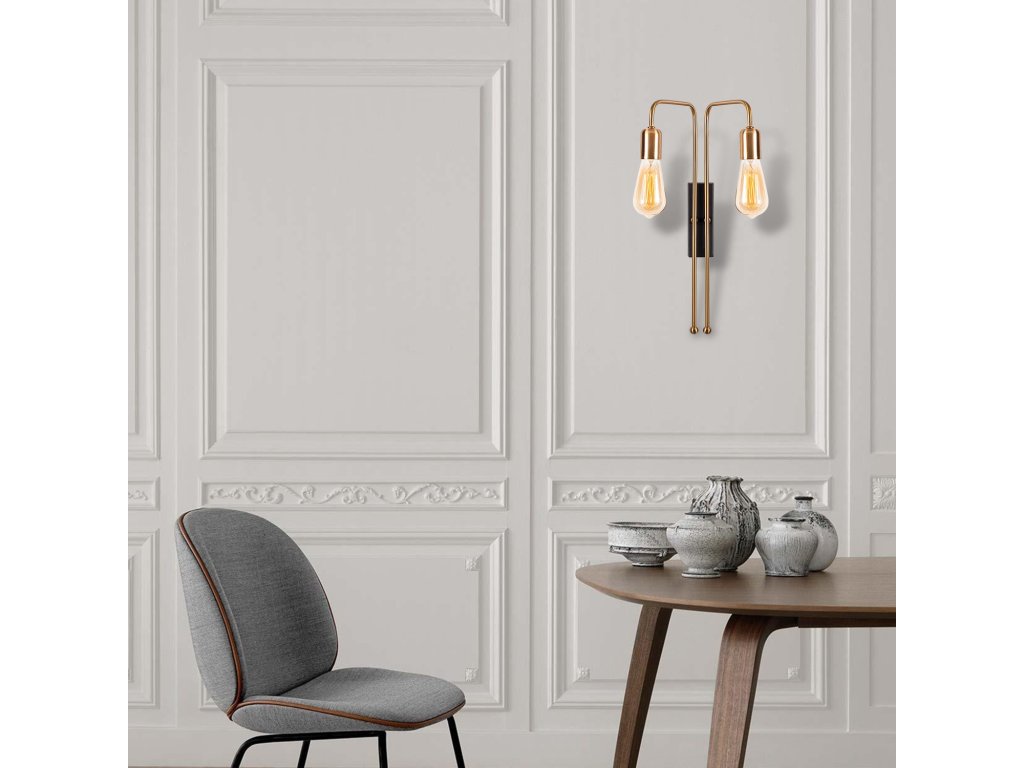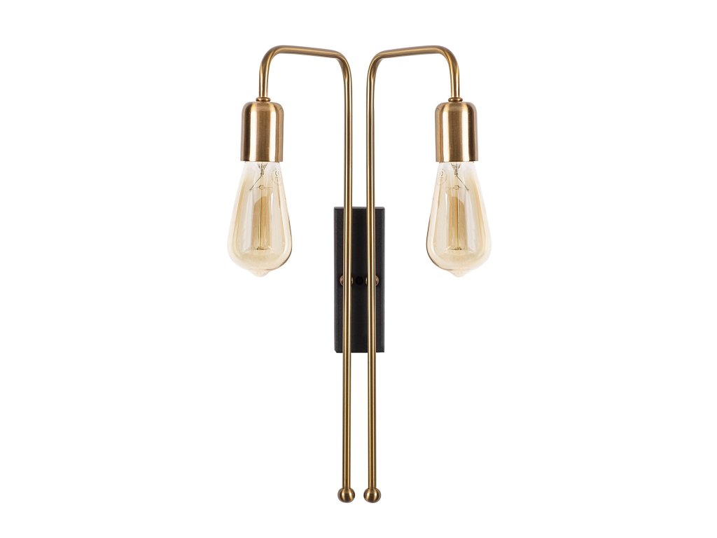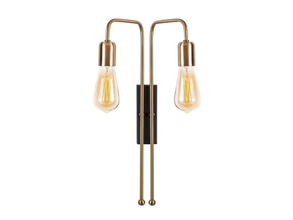 Nástěnné osvětlení MUM je tvořeno malou černou obdélníkovou základnou, na které spočívají dvě zlatá ohnutá ramena nesoucí objímky stejné barvy.