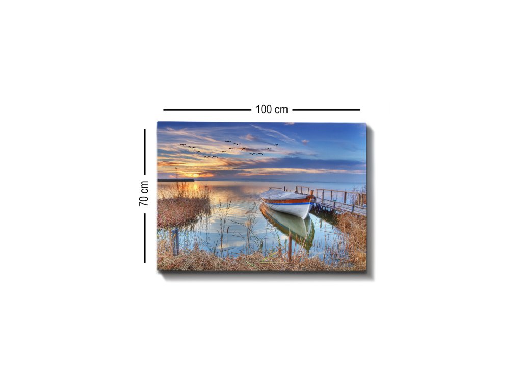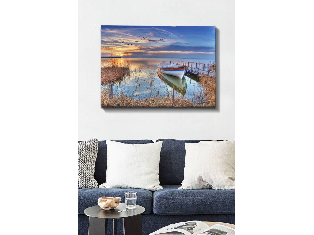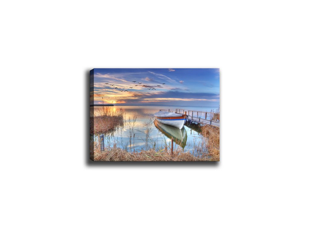 Představujeme Vám BOAT digitální tisk na plátno, tentokrát s designovým motivem osamělé loďky u malého mola ve světle zapadajícího slunce.