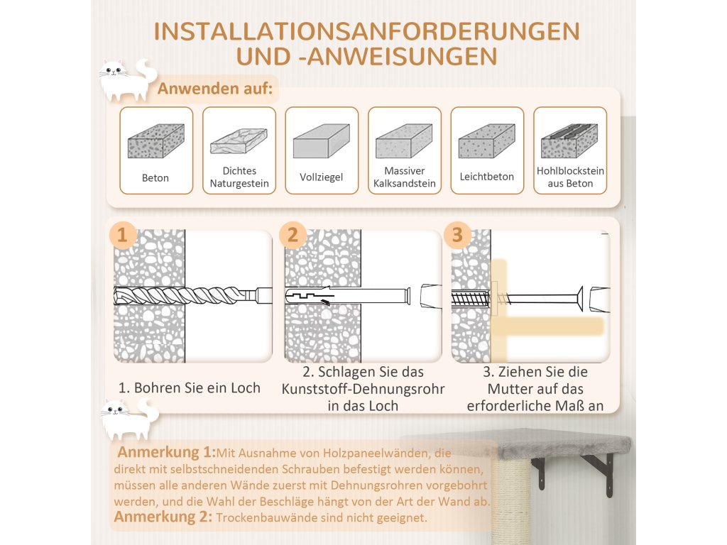 - ✔ Silné desky a kovové držáky nástěnného kočičího stromu zajišťují stabilitu a odolnost