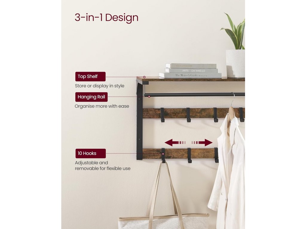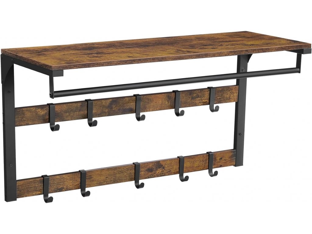 Nástěnný věšák s policí pro dokonalé řešení k udržení pořádku ve vaší předsíni! Tento nástěnný věšák je vybaven praktickou policí a konzolí, které nabízejí dostatek prostoru pro vaše kabáty, klobouky, šály a další věci. Díky 10 odnímatelným háčkům můžete věšák snadno přizpůsobit svým potřebám.