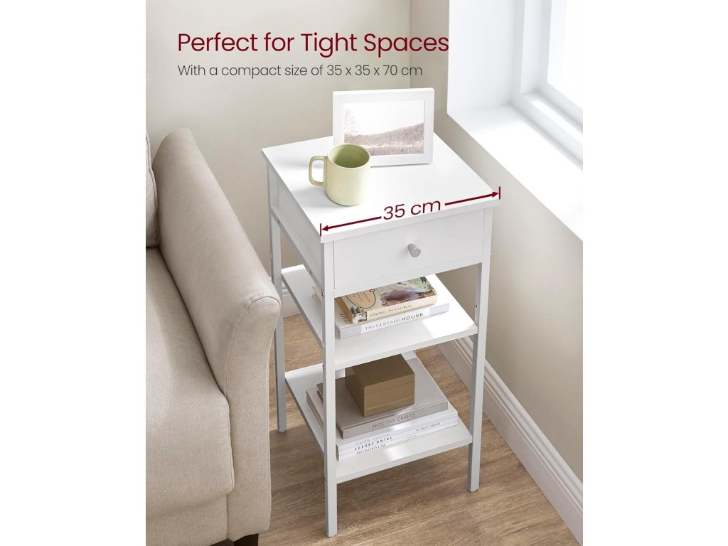 Díky svým rozměrům je tento noční stolek ideální do malých prostor. Ať už potřebujete místo na knihy, telefon nebo noční lampičku, bílý kompaktní noční stolek se zásuvkou a policemi vás jistě zaujme.