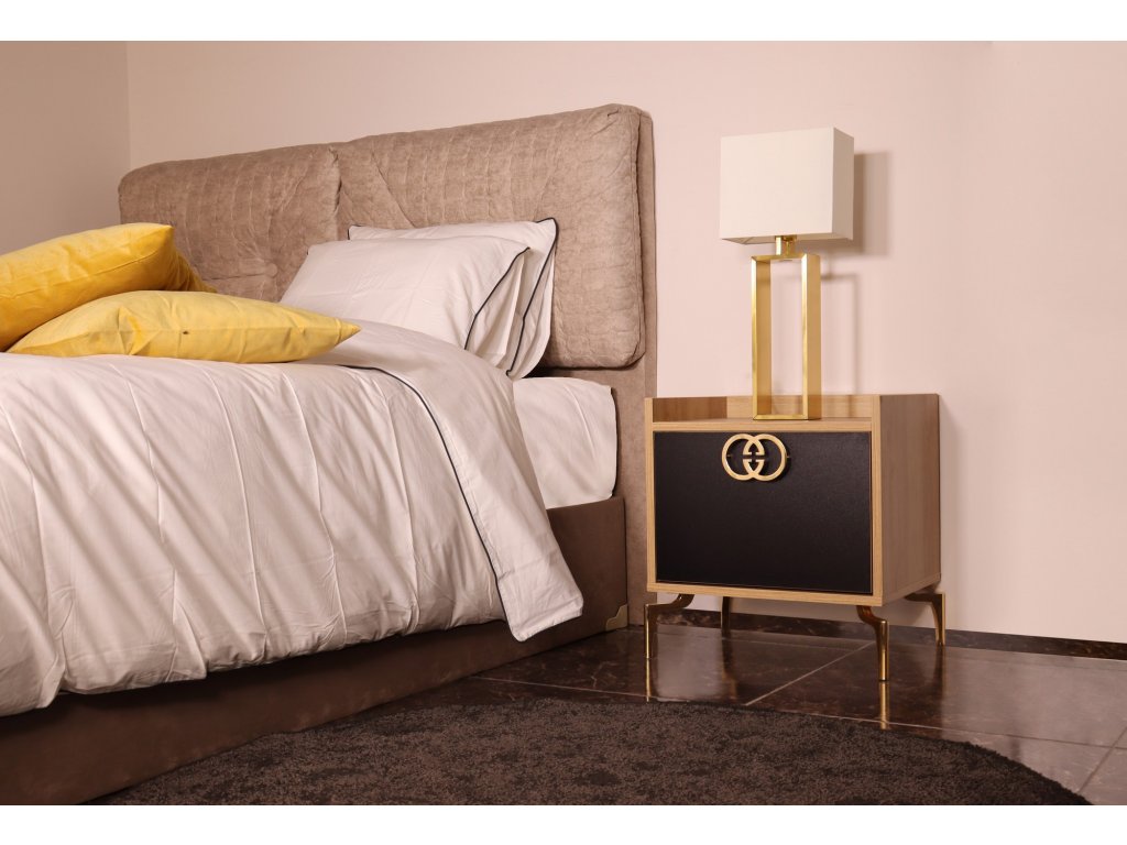 FESTI patří mezi elegantní moderní noční stolky s výrazným kovovým zlatým kováním na dvířkách a zlatými kovovými designovými nožkami.