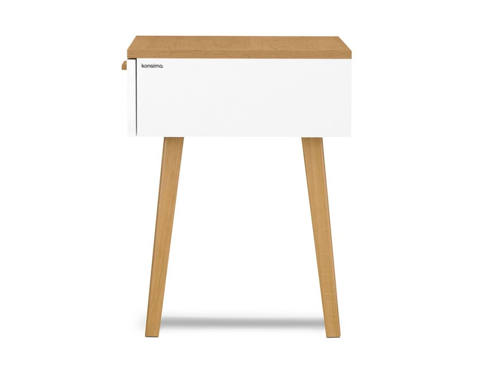 Moderní noční stolek s vysokými nohami vhodný nejen do ložnice. Kvalitní bílá deska v kombinaci s dekorem dubu - jedinečný vzhled.