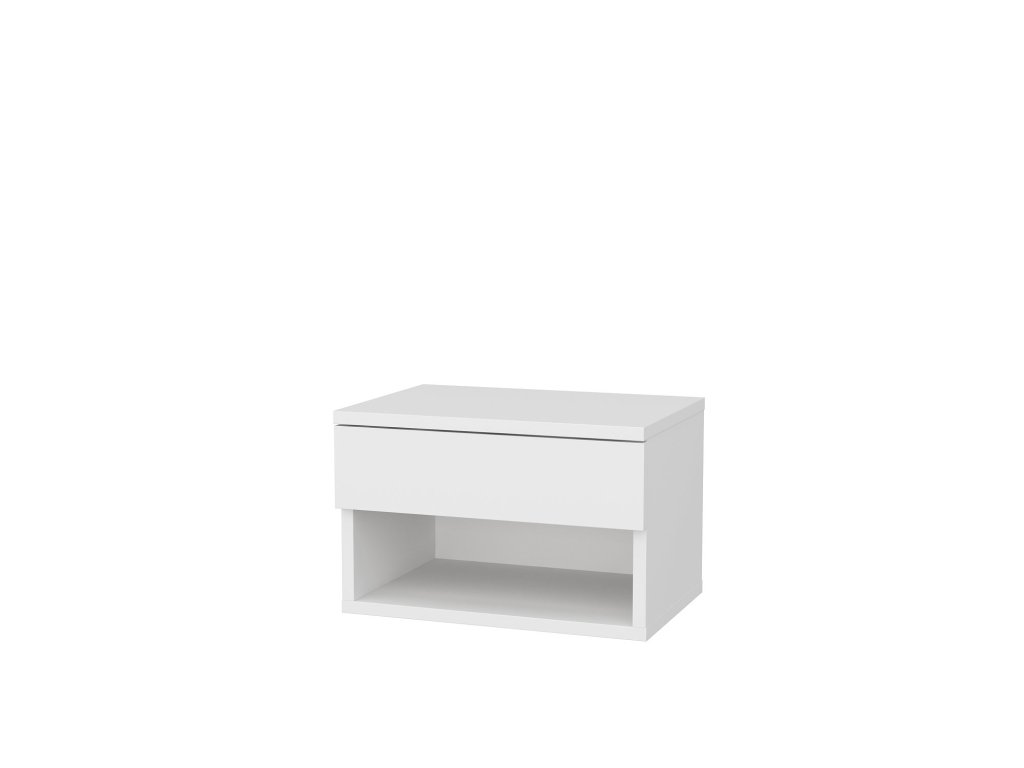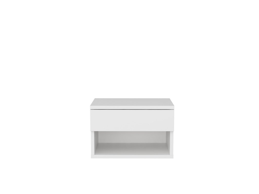 V bílé barvě vyrobený noční stolek JAMOT Vám nabídne jak odkládací plochy, tak i krytý úložný prostor.