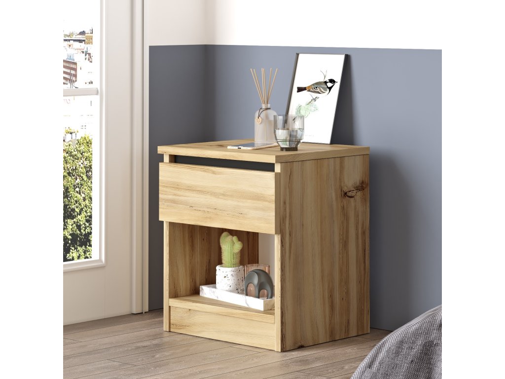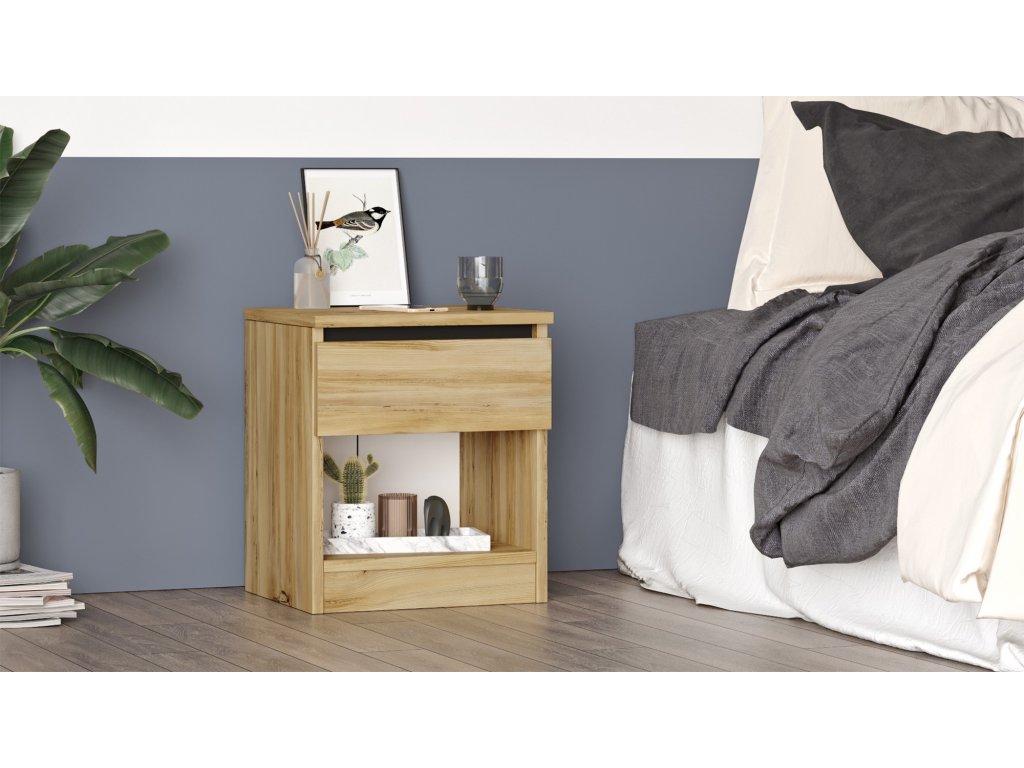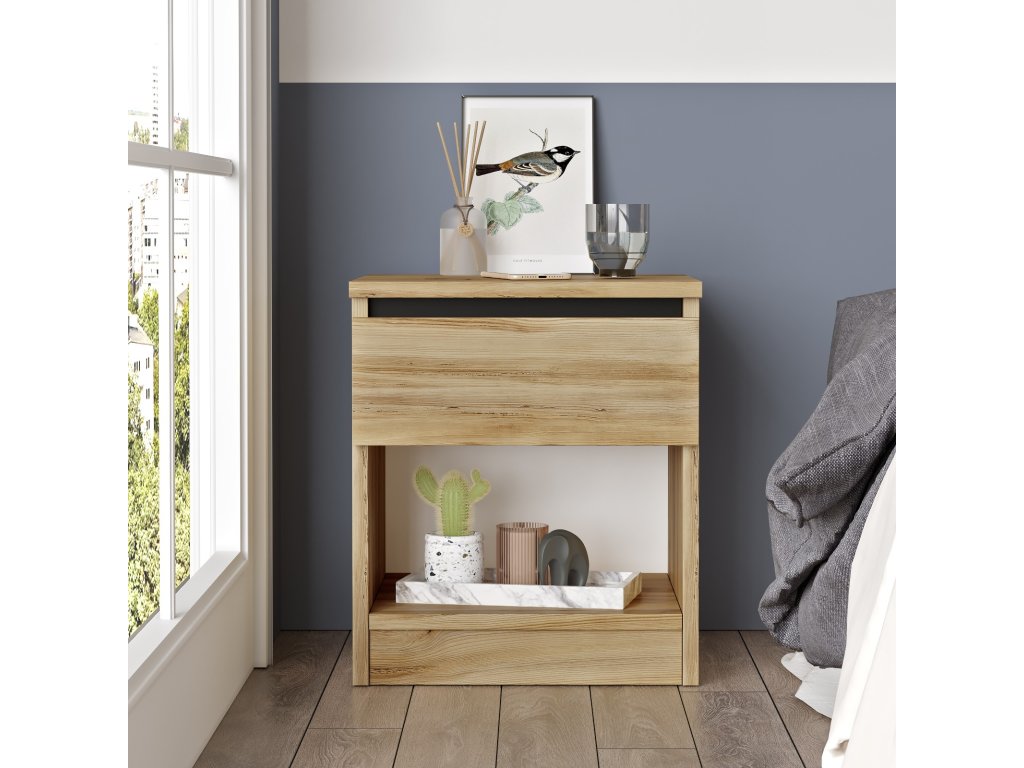 Noční stolek LV26 disponuje jedním šuplíčkem a jednou otevřenou skříňkou, do které pohodlně uložíte vše potřebné, co potřebujete mít po ruce.