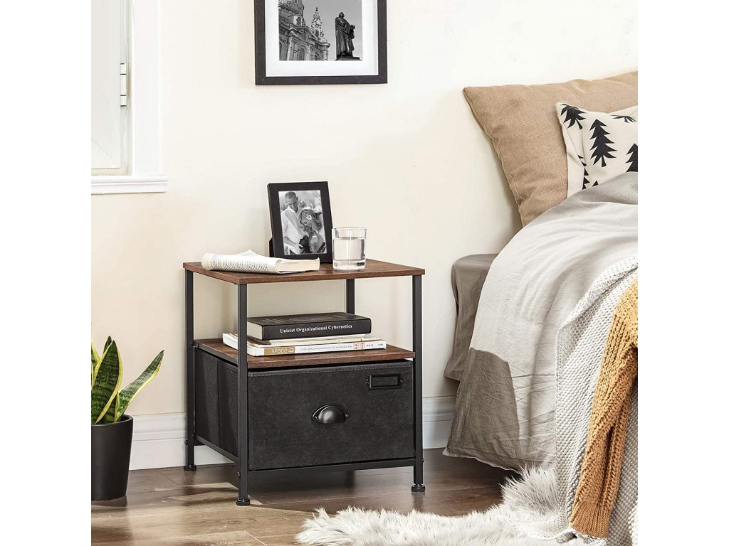 Hnědo-černý noční stolek s látkovou zásuvkou doplní do vaší ložnice částečně rustikální i industriální styl. Tento moderní a prostorově úsporný noční stolek je navržen tak, aby splňoval všechny vaše požadavky na úložný prostor.