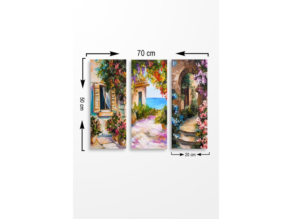 Prohlédněte si tuto úchvatnou sadu třídílného obrazu, jejíž jednotlivé díly o rozměrech 20 x 50 cm dohromady tvoří fascinující celek o rozměrech 70 x 50 cm. Ponořte se do poklidné přímořské scény, kde hrdě stojí tři okouzlující domky.