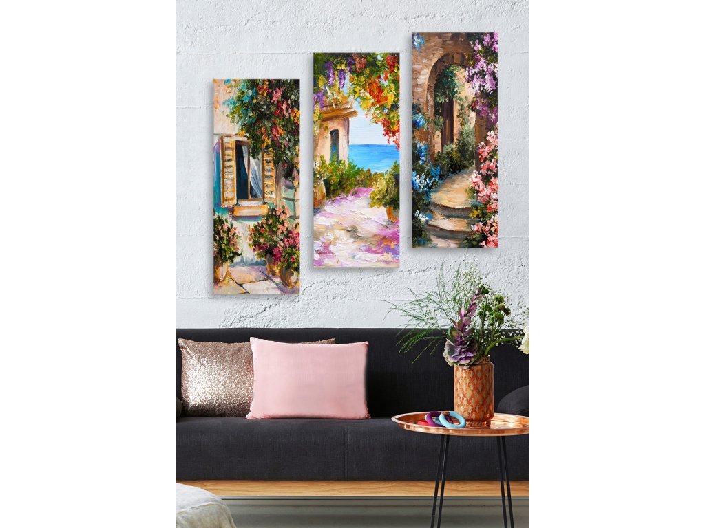 Ideální pro vnesení pocitu pobřežního šarmu a elegance do jakéhokoli prostoru. Nechte se těmito třemi kousky přenést do světa klidné krásy přímořských domků a malebných zákoutí. Dodejte svému interiéru nádech poklidné blaženosti s tímto úžasným romantickým triptychem.