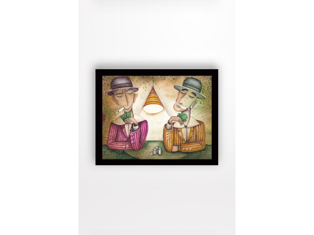 Právě si prohlížíte úžasný obraz na MDF desce v černém rámu, naprosto mistrovské dílo, které promění každý prostor v úchvatné dekorativní dílo! Tento pozoruhodný obraz, vytvořený s maximální precizností, zobrazuje házeče karet v buřinkách, oba kouřící cigaretu, prostě výjev, který vyzařuje tajemství a intriky.