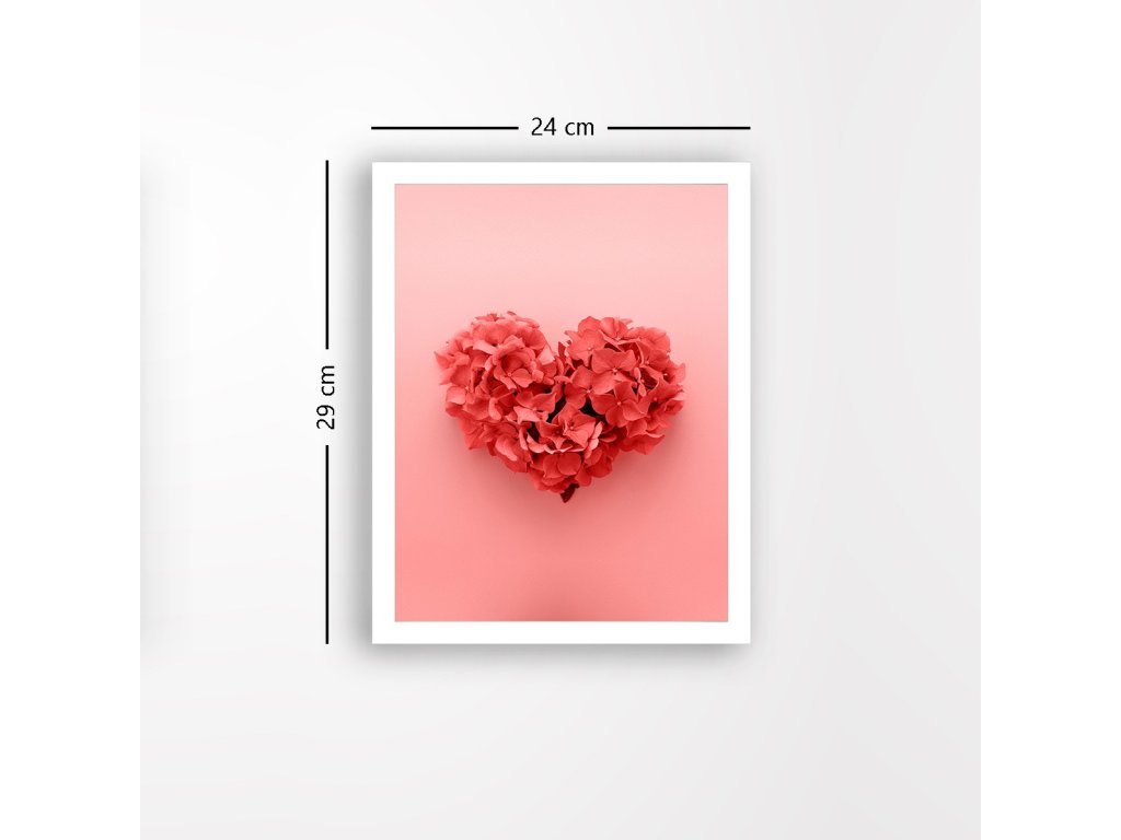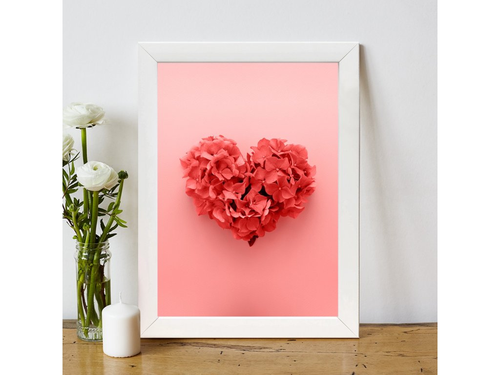 Úžasný bíle orámovaný obraz na MDF desce, který je dokonalým doplňkem pro rozjasnění každého prostoru! Pokochejte se fascinujícím obrazem zářivě červeného srdce tvořeného jemnými kvítky patrně hortenzií, které nádherně kontrastuje s podmanivým růžovým pozadím.