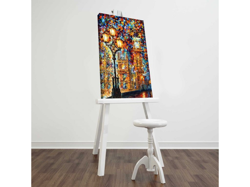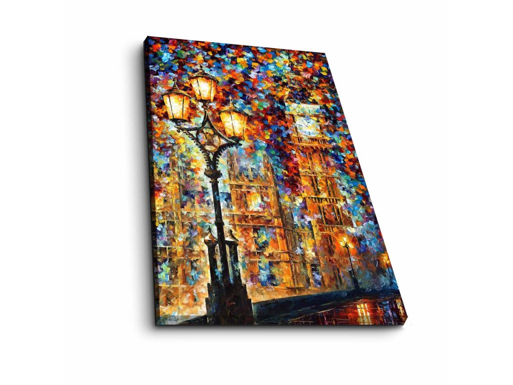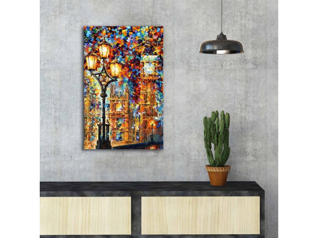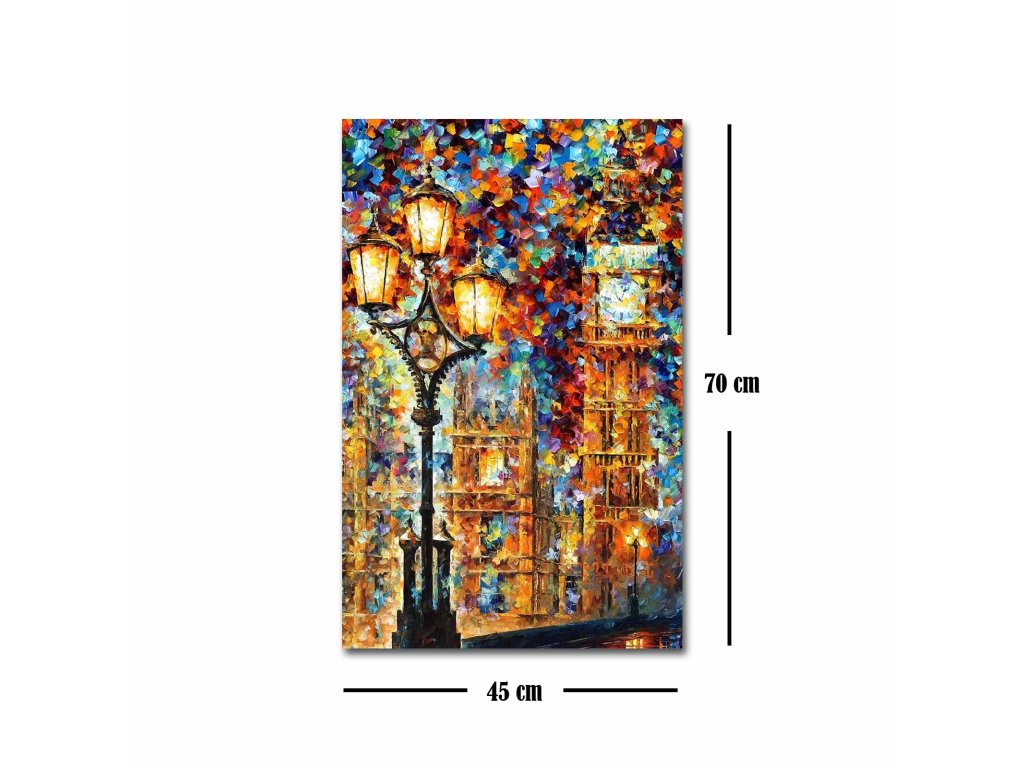 Umělecké dílo s podmanivým výjevem do za spoustou barev zahaleného Big Benu, v jehož popředí jasně svítí pouliční lampa, vás přenese do rušných ulic Londýna.