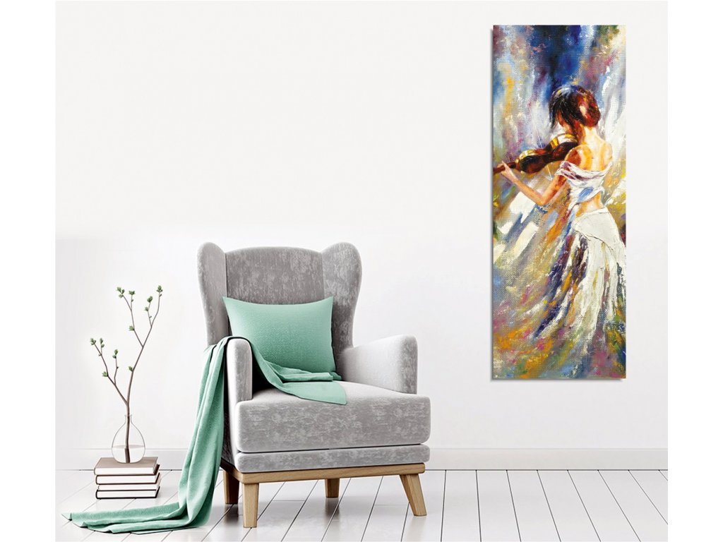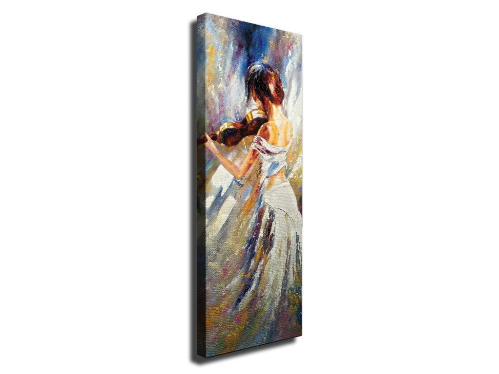 Pozvedněte svůj interiér tímto sugestivním uměleckým dílem, které v sobě dokonale spojuje umění a smyslnost. Představuje podmanivý obraz spoře oblečené ženy ladně držící housle, otočené k divákovi zády. Elegantní kompozice zobrazuje holá záda a vyzařuje atmosféru tajemna a půvabů.