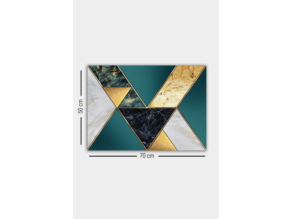 Připravte se na to, že vás okouzlí trojúhelníky různých velikostí a barev elegantně vystavené na luxusním mramorovém podkladu. Zlaté prvky dodávají obrazu nádech luxusu a dokonale doplňují podmanivé modravé odstíny mramoru. Díky rozměrům 50 x 70 cm bude toto dekorativní dílo působit odvážně v každé místnosti a bude na sebe bude strhávat pozornost, o které se bude mluvit.