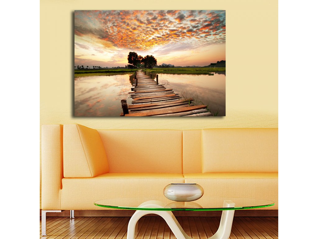 Proměňte svůj obytný prostor pomocí úchvatného obrazu na semišovém plátně. Ponořte se do úžasného vyobrazení klidného mola nebo dlouhé dřevěné lávky, která slibuje přechod vodní hladiny suchou nohou. Složité detaily jednotlivých dřevěných prken dodávají tomuto dekorativnímu dílu hloubku a texturu a vytváří vizuálně fascinující zážitek.