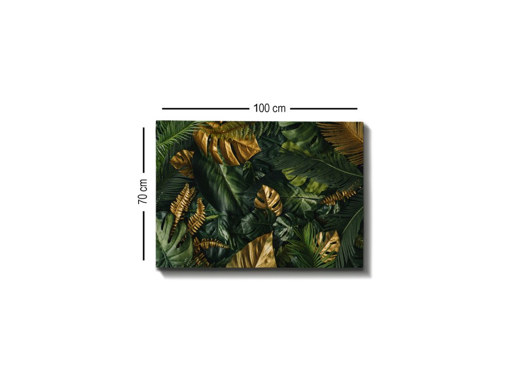 Ponořte se do zelené a zlaté barvy, které se překrývají na listech monster a jiných rostlin zobrazených zblízka na jedné hromadě. Zlatá barva a složité textury vdechují listům nádech luxusu a vytváří podmanivý vizuální zážitek. Toto dekorativní dílo o velkorysých rozměrech 100 x 70 cm si žádá pozornost a stane se ústředním bodem každé místnosti.