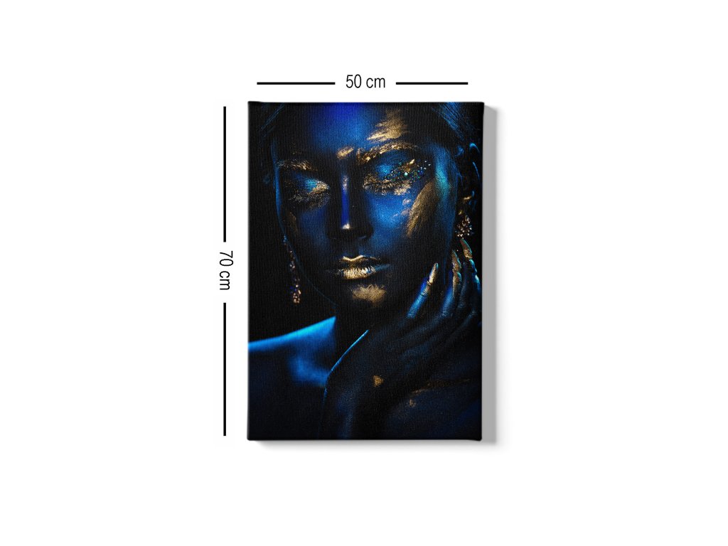 Nechte své smysly uchvátit úžasným obrazem na plátně, jenž jako podmanivé dekorativní dílo v sobě spojuje eleganci a smyslný podtón. Toto nádherné dekorativní dílo, vytvořené s maximální precizností, zobrazuje ženu namalované v hypnotizujících modrých a zlatých tónech, které dodají každému prostoru nádech luxusu a smyslnosti.