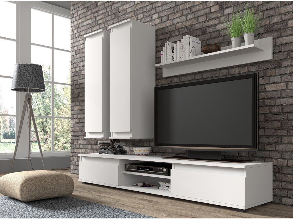 Stěna LUSIA je prostorná, a obsahuje televizní stolek, dvě nástěnné skříňky a poličku.